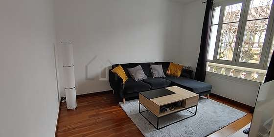 SalónEste apartamento está formado por un salón con parquet en el suelo y ventanas doble acristalamiento. Este salón muy tanquilo está amueblado y equipado para que su estancia sea agradable : televisor, sofá, mesita.