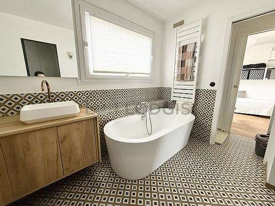 Este dúplex tiene una sala de baño agradable y clara. Este baño tiene todo lo necesario para su bienestar diario : bañera, ducha, sink, radiador seca-toallas. El WC está separado de la sala del baño y ubicado en un espacio independiente.