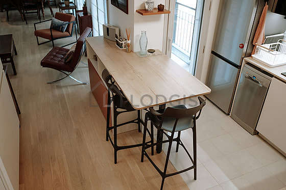 Este apartamento posee una magnífica cocina con azulejo en el sueloy todo el equipamiento indispensable para su vida diaria : placas eléctricas, refrigerador, congelador, horno, micro ondas, campana extractora, tostador, hervidor, cafetera, mesita, armario empotrado, vajilla, 4 silla(s).