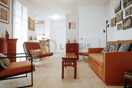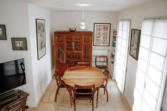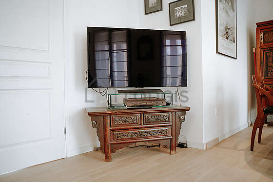 SalónEste apartamento está formado por un salón con parquet en el suelo y ventanas doble acristalamiento. Este salón muy tanquilo está amueblado y equipado para que su estancia sea agradable : televisor, sofá, mesa, 6 silla(s).