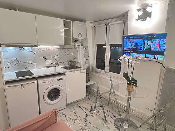 Este apartamento posee una bonito cocina con azulejo en el sueloy todo el equipamiento esencial para su vida diaria : placas eléctricas, refrigerador, congelador, campana extractora.
