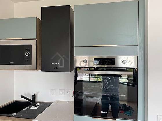 Este apartamento posee una cocinay todo el equipamiento esencial para su vida diaria : placas eléctricas, refrigerador, horno, micro ondas, campana extractora, cafetera, vajilla.