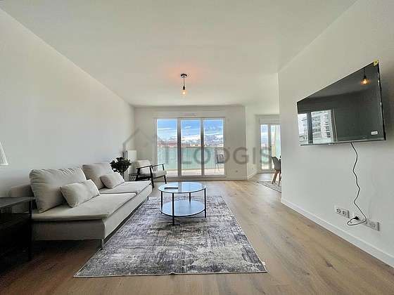Este apartamento está formado por un salón con parquet en el suelo y ventanas. Este salón muy tanquilo está amueblado y equipado para que su estancia sea agradable : televisor, sofá, mesita.