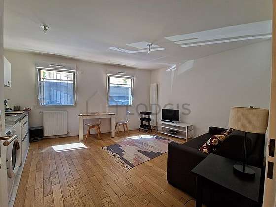 SalónEste apartamento está formado por un salón con parquet en el suelo y ventanas y una vista a la calle. Este salón muy tanquilo está amueblado y equipado para que su estancia sea agradable : televisor, placas eléctricas, mesa, armario empotrado, vajilla, 1 silla(s)1 sofá cama.