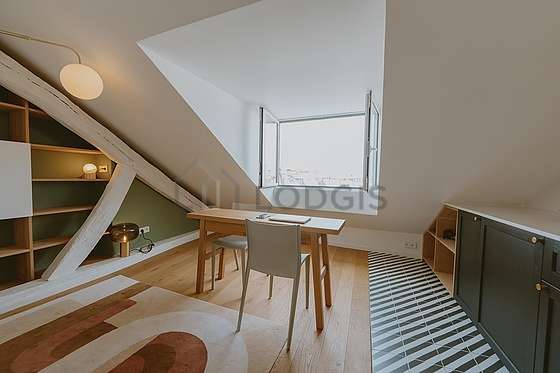 SalónEste apartamento está formado por un salón con parquet en el suelo y ventanas. Este salón muy tanquilo está amueblado y equipado para que su estancia sea agradable : sofá, mesa, mesa de estudio, biblioteca, armario empotrado, carpet.