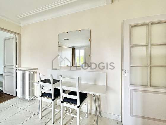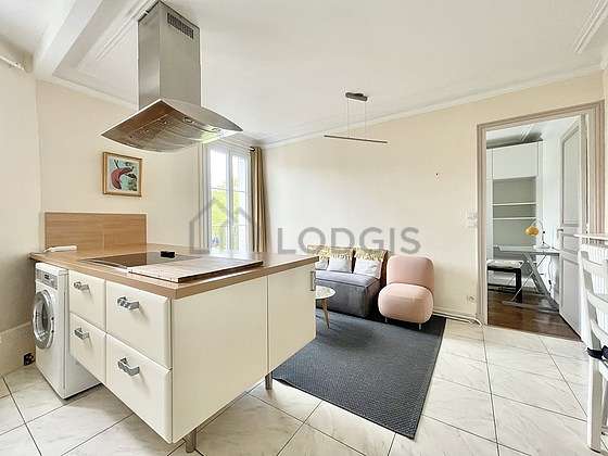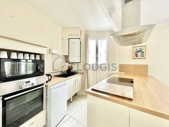 Este apartamento posee una cocina con azulejo en el sueloy todo el equipamiento indispensable para su vida diaria : placas eléctricas, refrigerador, congelador, horno, micro ondas, congelador, campana extractora, tostador, hervidor, cafetera, vajilla.