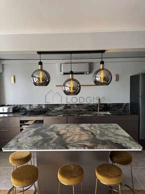 Este apartamento posee una cocinay todo el equipamiento esencial para su vida diaria : placas eléctricas, refrigerador, congelador, horno, micro ondas, congelador, aspirador, tostador, cafetera, mesa, estantería, vajilla, taburete, vase.