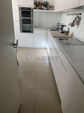 Este apartamento posee una cocina con azulejo en el sueloy todo el equipamiento indispensable para su vida diaria : placas eléctricas, refrigerador, congelador, horno, micro ondas, congelador, campana extractora, tostador, hervidor, cafetera, vajilla.