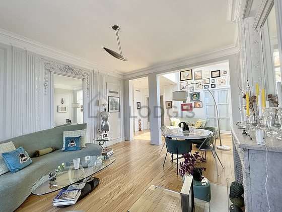 SalónEste apartamento está formado por un salón con parquet en el suelo y ventanas doble acristalamiento. Este salón muy tanquilo está amueblado y equipado para que su estancia sea agradable : sofá, 1 sillones, mesa, mesita, cómoda, chimenea, 1 silla(s), columnas, floor lamp, chandelier, mirror, painting.