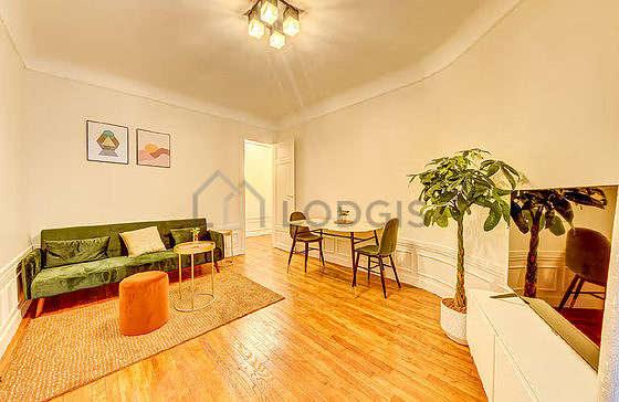 SalónEste apartamento está formado por un salón con parquet en el suelo y ventanas doble acristalamiento. Este salón está amueblado y equipado para que su estancia sea agradable : televisor, sofá, mesa, 2 silla(s), tv stand, curtains, carpet.