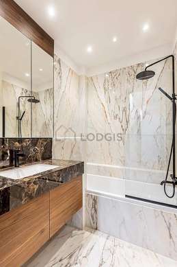 Este apartamento tiene una sala de baño magnífica. Este baño tiene todo lo necesario para su bienestar diario : bañera, ducha, radiador seca-toallas. El WC está integrado en la sala del baño.