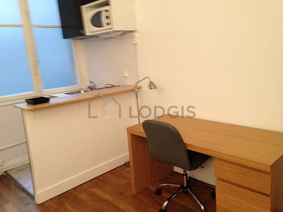 Este apartamento posee una cocinay todo el equipamiento necesario para su vida diaria : placas eléctricas, refrigerador, horno, micro ondas, mesa, estantería, armario empotrado, vajilla, 1 silla(s), bar, sink, bin, ventilator.