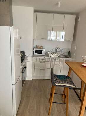 Este apartamento posee una cocina con parquet en el sueloy todo el equipamiento indispensable para su vida diaria : refrigerador, congelador, horno, micro ondas, campana extractora, tostador, hervidor, sink.