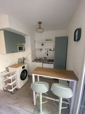 Este apartamento posee una cocina con parquet en el sueloy todo el equipamiento esencial para su vida diaria : placas eléctricas, refrigerador, micro ondas, aspirador, tostador, cafetera, armario empotrado, vajilla, taburete, sink, bin.