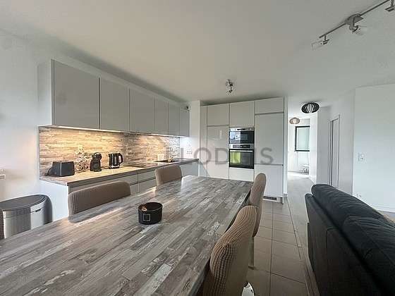 Este apartamento posee una bonito cocina con azulejo en el sueloy todo el equipamiento indispensable para su vida diaria : placas eléctricas, refrigerador, congelador, horno, micro ondas, campana extractora, tostador, hervidor, cafetera, mesa, armario empotrado, vajilla, 6 silla(s), sink, bin.