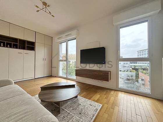SalónEste apartamento está formado por un salón con parquet en el suelo y ventanas doble acristalamiento. Este salón tranquilo está amueblado y equipado para que su estancia sea agradable : televisor, mesita, tv stand1 sofá cama, 1 armario cama.