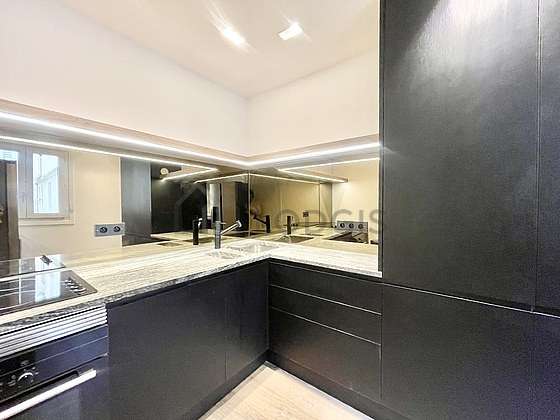 Este apartamento posee una cocina con parquet en el sueloy todo el equipamiento indispensable para su vida diaria : placas eléctricas, refrigerador, congelador, horno, congelador, campana extractora, bin.