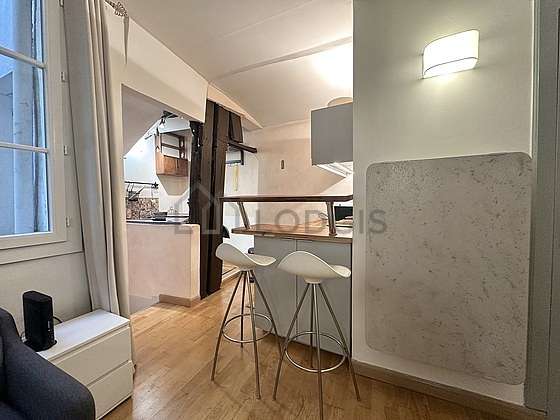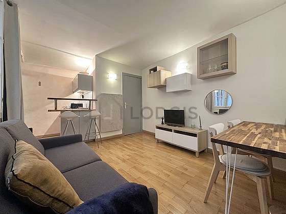 SalónEste apartamento está formado por un salón con parquet en el suelo y ventanas doble acristalamiento y una vista a al patio. Este salón tranquilo está amueblado y equipado para que su estancia sea agradable : televisor, mesa de estudio, armario empotrado, 1 silla(s), tv stand1 sofá cama.