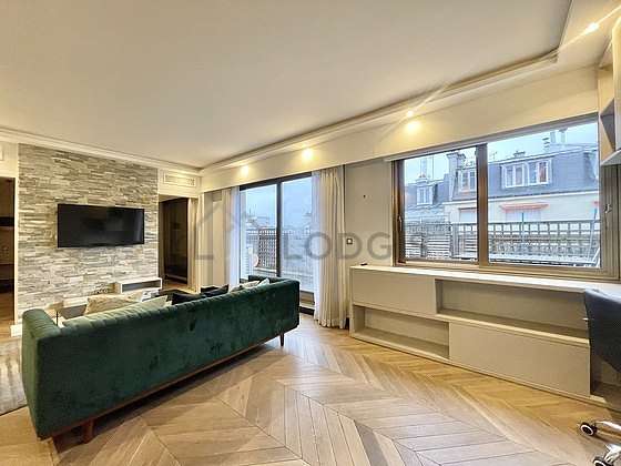 Este apartamento está formado por un salón con parquet en el suelo y ventanas doble acristalamiento. Este salón está amueblado y equipado para que su estancia sea agradable : televisor, sofá, mesita, mesa de estudio, 3 silla(s), carpet.