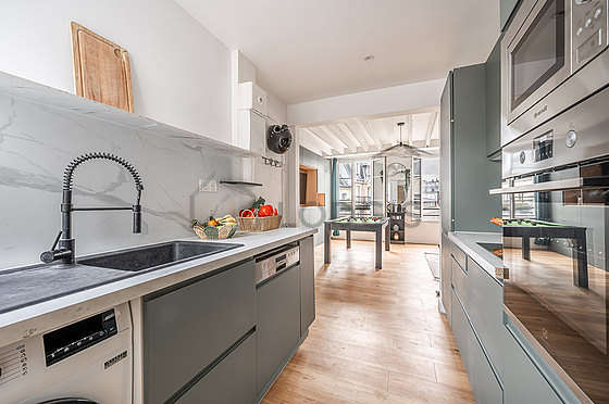 Este apartamento posee una cocina con parquet en el sueloy todo el equipamiento necesario para su vida diaria : placas eléctricas, refrigerador, congelador, horno, micro ondas, congelador, campana extractora, hervidor, cafetera.