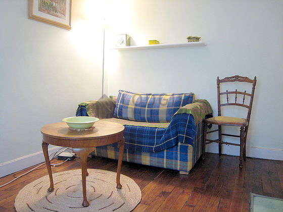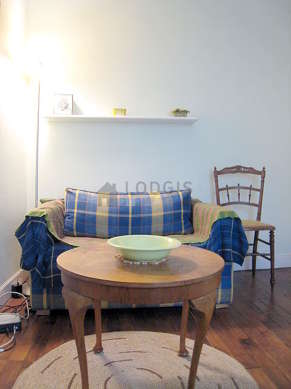 Este apartamento está formado por un salón con parquet en el suelo y ventanas doble acristalamiento y una vista a al patio. Este salón tranquilo está amueblado y equipado para que su estancia sea agradable : sofá, mesa, mesita, estantería, 2 silla(s), taburete.