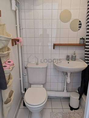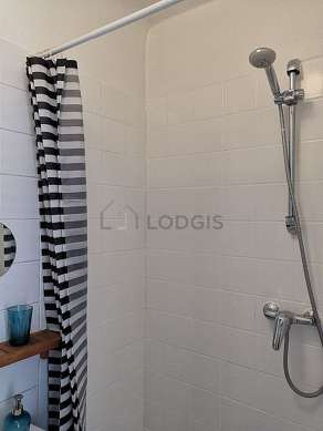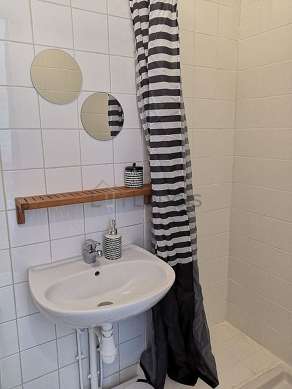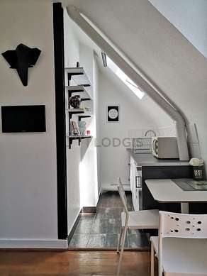 Este apartamento posee una cocina con azulejo en el sueloy todo el equipamiento indispensable para su vida diaria : placas eléctricas, refrigerador, micro ondas, hervidor, estantería, armario empotrado, vajilla.