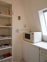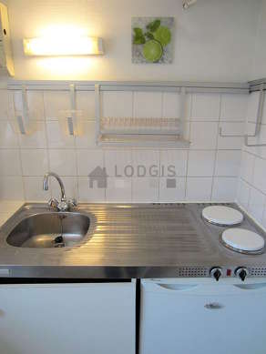 Este apartamento posee una cocina con azulejo en el sueloy todo el equipamiento indispensable para su vida diaria : placas eléctricas, refrigerador, horno micro-ondas, congelador, tostador, cafetera, estantería, armario empotrado, vajilla.