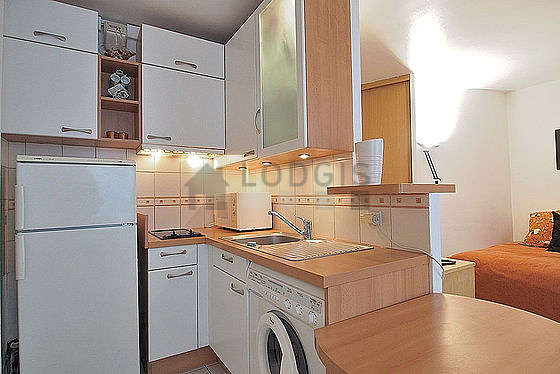 Este apartamento posee una bonito cocina con azulejo en el sueloy todo el equipamiento necesario para su vida diaria : placas eléctricas, refrigerador, congelador, horno, horno micro-ondas, campana extractora, tostador, hervidor, cafetera, mesa, armario empotrado, vajilla, taburete.