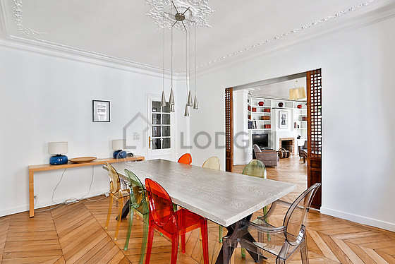Con el fin de compartir vuestras comidas en un ambiente distendido durante su estancia en París, este apartamento posee un agradable comedor que podrá reunir hasta 8 invitados gracias a mesa, estantería, armario empotrado, 8 silla(s).
