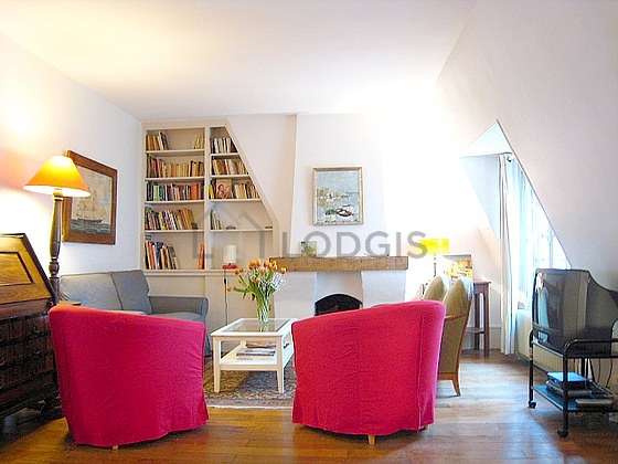 Este apartamento está formado por un salón con parquet en el suelo y ventanas y una vista a al patio. Este salón muy tanquilo está amueblado y equipado para que su estancia sea agradable : televisor, sofá, 3 sillones, mesita, mesa de estudio, biblioteca, aparador, chimenea, 1 silla(s).