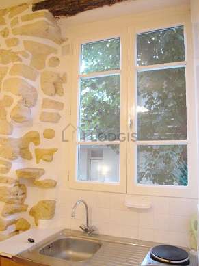 Este apartamento está formado por un salón con linoleum en el suelo y ventanas y una vista a al patio. Este salón tranquilo está amueblado y equipado para que su estancia sea agradable : televisor, sábanas, mesa, ropero, estantería, piedras aparentes, 4 silla(s)1 cama.