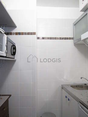 Este apartamento posee una cocina con azulejo en el sueloy todo el equipamiento esencial para su vida diaria : placas eléctricas, refrigerador, horno, micro ondas, congelador, campana extractora, tostador, hervidor, cafetera, estantería, armario empotrado, vajilla.