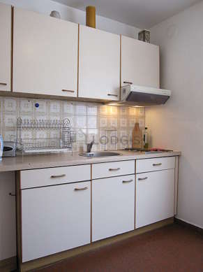Este apartamento posee una cocina con azulejo en el sueloy todo el equipamiento indispensable para su vida diaria : placas eléctricas, refrigerador, congelador, horno micro-ondas, campana extractora, hervidor, cafetera, armario empotrado, vajilla, taburete.