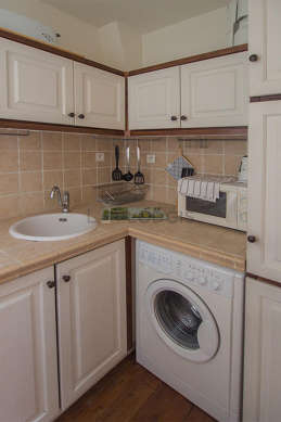 Este apartamento posee una cocina con azulejo en el sueloy todo el equipamiento esencial para su vida diaria : placas eléctricas, refrigerador, micro ondas, congelador, tostador, hervidor, cafetera, armario empotrado, vajilla.