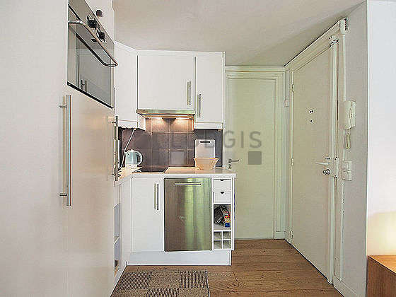 Este apartamento posee una bonito cocina con parquet en el sueloy todo el equipamiento necesario para su vida diaria : placas eléctricas, refrigerador, congelador, horno micro-ondas, campana extractora, tostador, hervidor, cafetera, armario empotrado, vajilla.