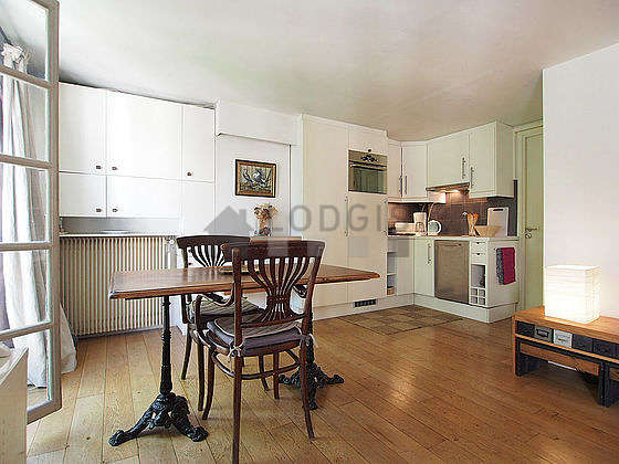 Este apartamento está formado por un salón con parquet en el suelo y ventanas y una vista a al patio. Este salón tranquilo está amueblado y equipado para que su estancia sea agradable : televisor, sábanas, mesa, mesita, ropero, estantería, armario empotrado, 4 silla(s)1 sofá cama.