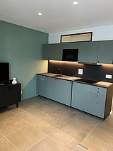 Este apartamento posee una cocina con azulejo en el sueloy todo el equipamiento esencial para su vida diaria : placas eléctricas, refrigerador, congelador, tostador, hervidor, cafetera, estantería, armario empotrado, vajilla.