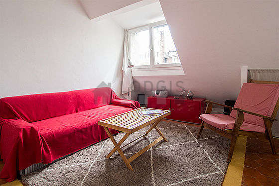Este apartamento está formado por un salón con terrazo en el suelo y ventanas doble acristalamiento y una vista a al patio. Este salón tranquilo está amueblado y equipado para que su estancia sea agradable : 1 sillones, mesa, mesita, estantería, cómoda, 4 silla(s)1 sofá cama.