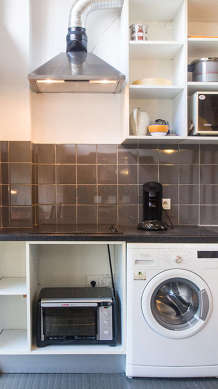Este apartamento posee una cocina con parquet en el sueloy todo el equipamiento esencial para su vida diaria : placas eléctricas, refrigerador, congelador, horno, micro ondas, tostador, cafetera, mesa, vajilla, 1 silla(s).