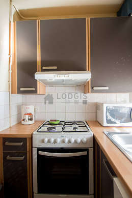 Este apartamento posee una bonito cocina con azulejo en el sueloy todo el equipamiento esencial para su vida diaria : placas eléctricas, refrigerador, congelador, horno, micro ondas, campana extractora, tostador, cafetera, armario empotrado, vajilla.