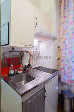 Este apartamento posee una bonito cocina con parquet en el sueloy todo el equipamiento necesario para su vida diaria : placas eléctricas, refrigerador, micro ondas, congelador, campana extractora, tostador, hervidor, mesa, estantería, armario empotrado, vajilla, 2 silla(s).