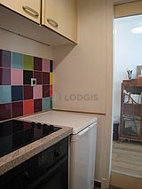 Este apartamento posee una bonito cocina con azulejo en el sueloy todo el equipamiento esencial para su vida diaria : placas eléctricas, refrigerador, horno, congelador, tostador, hervidor, cafetera, armario empotrado, vajilla.