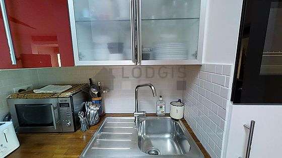 Este apartamento posee una magnífica cocina contiguo al salón con parquet en el sueloy todo el equipamiento necesario para su vida diaria : placas eléctricas, refrigerador, congelador, horno, micro ondas, campana extractora, tostador, hervidor, cafetera, armario empotrado, vajilla, 4 silla(s), taburete, bar.
