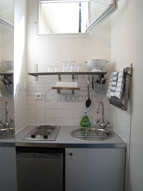 Este apartamento posee una bonito cocina con azulejo en el sueloy todo el equipamiento esencial para su vida diaria : placas eléctricas, refrigerador, micro ondas, congelador, hervidor, estantería, armario empotrado, vajilla.