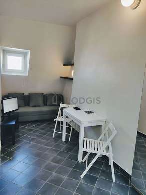 SalónEste apartamento está formado por un salón con azulejo en el suelo y ventanas y una vista a la calle. Este salón tranquilo está amueblado y equipado para que su estancia sea agradable : televisor, sábanas, edredones, mesa, ropero, estantería, 2 silla(s)1 sofá cama.
