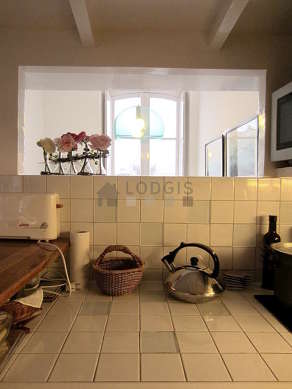 Este apartamento posee una cocina con azulejo en el sueloy todo el equipamiento necesario para su vida diaria : placas eléctricas, refrigerador, horno micro-ondas, congelador, tostador, hervidor, cafetera, estantería, armario empotrado, vajilla, electrodomésticos.