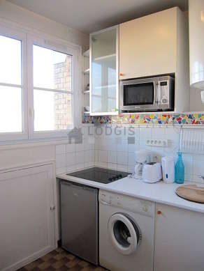 Este apartamento posee una bonito cocina con azulejo en el sueloy todo el equipamiento esencial para su vida diaria : placas eléctricas, refrigerador, congelador, horno micro-ondas, tostador, hervidor, cafetera, mesa, estantería, armario empotrado, vajilla, taburete.