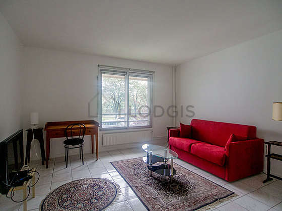 SalónEste apartamento está formado por un salón con azulejo en el suelo y ventanas y una vista a la calle. Este salón está amueblado y equipado para que su estancia sea agradable : televisor, sábanas, edredones, 1 sillones, mesa, estantería, cómoda, 4 silla(s)1 sofá cama.