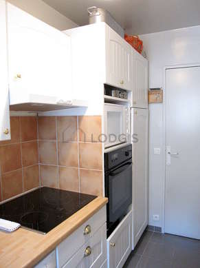 Este apartamento posee una bonito cocina con azulejo en el sueloy todo el equipamiento necesario para su vida diaria : placas eléctricas, refrigerador, congelador, horno, horno micro-ondas, campana extractora, tostador, hervidor, cafetera, armario empotrado, vajilla, taburete.