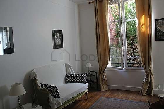 SalónEste apartamento está formado por un salón con parquet en el suelo y ventanas y una vista a jardín. Este salón muy tanquilo está amueblado y equipado para que su estancia sea agradable : televisor, sábanas, edredones, sofá, mesa, ropero, estantería, armario empotrado, 3 silla(s)1 cama.